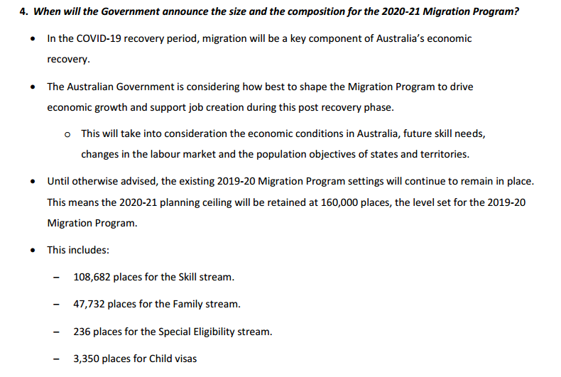 澳洲移民局同時公布了2020-2021財年澳洲移民計劃Q&A,針對大家關(guān)注的移民配額、州擔(dān)保發(fā)放、EOI邀請以及未來澳洲移民前景等相關(guān)問題一一作了解答。