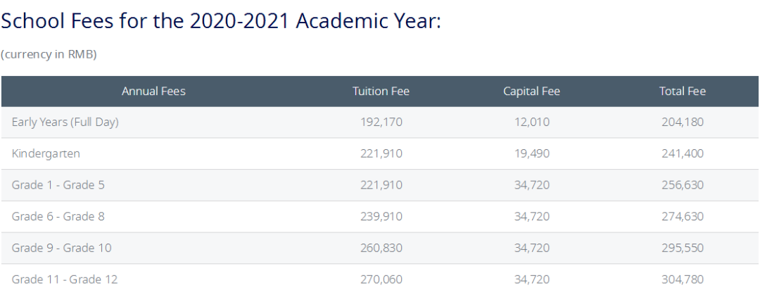 比如北京順義國際學(xué)校,2020/2021幼兒園24萬人民幣每年,11-12年級30.5萬人民幣每年。