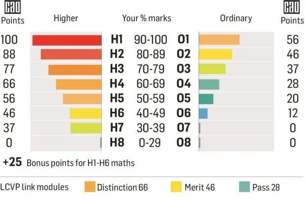 愛爾蘭高考滿分為625分(六門課單科成績為滿分100分,其中數學只要及格就獲得25分附加分)。學生的百分制分數會轉換成相應的1-8等級計分方式,包括“高級水平(H)”和“普通水平(O)”(考生可以根據自身情況選擇考試等級),每個等級會獲得不同的CAO點數,這些點數疊加用來申請理想的學校和專業。