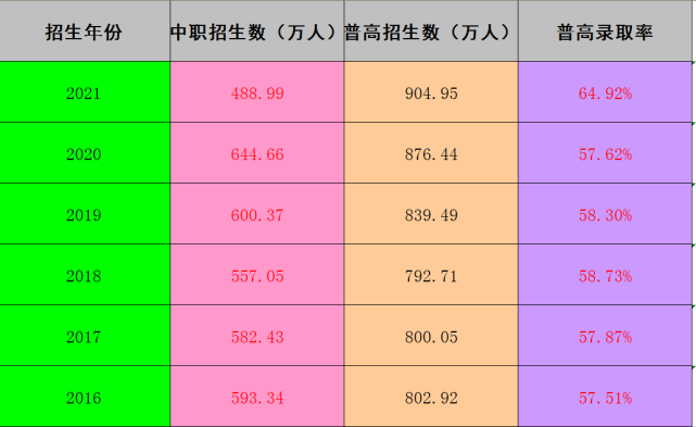 從上圖看,2016年至2021年,全國普通高中招生人數從802萬提高到904萬,增幅達12.5%。雖然普通高中的錄取率逐年提升,但是每年仍有數百萬學生被分流到職業學校學習。