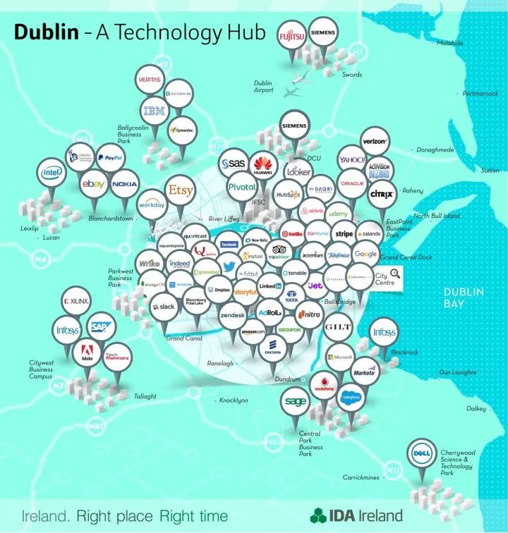 眾多歐美及中國(guó)互聯(lián)網(wǎng)科技公司都在愛爾蘭有非常大的運(yùn)營(yíng)規(guī)模,并以愛爾蘭作為中心輻射全球市場(chǎng)。比如蘋果、谷歌、Meta、微軟、亞馬遜、LinkedIn、Twitter、IBM、英特爾、華為和抖音等大型科技公司。