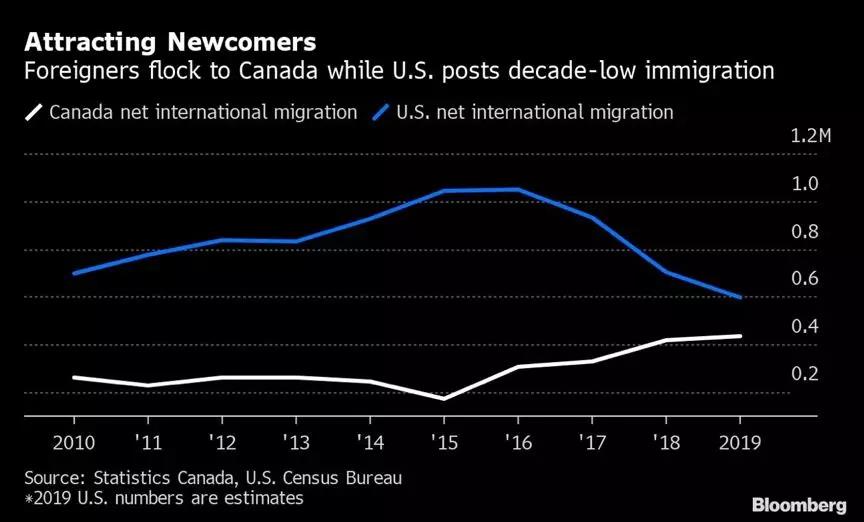 2019年,加拿大接收了43.7萬新移民,實(shí)現(xiàn)了30年來最快的人口增長(zhǎng)。反觀美國(guó),雖然人口基數(shù)龐大(為加拿大人口的10倍),國(guó)際移民卻連續(xù)第三年大幅下降,僅接收了59.5萬新移民,為近十年最低點(diǎn)。
