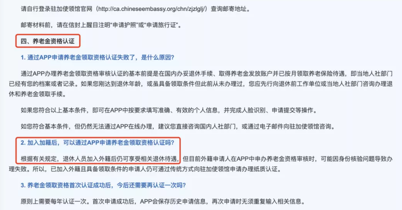 A:根據(jù)有關(guān)規(guī)定,退休人員加入外籍后仍可享受相關(guān)退休待遇,但目前外籍申請人在APP中申辦養(yǎng)老金資格審核時,可能因身份核驗問題導(dǎo)致辦理失敗。所以,已加入外籍且具備領(lǐng)取條件的申請人仍可通過傳統(tǒng)方式向駐加使領(lǐng)館申請辦理紙質(zhì)認(rèn)證。