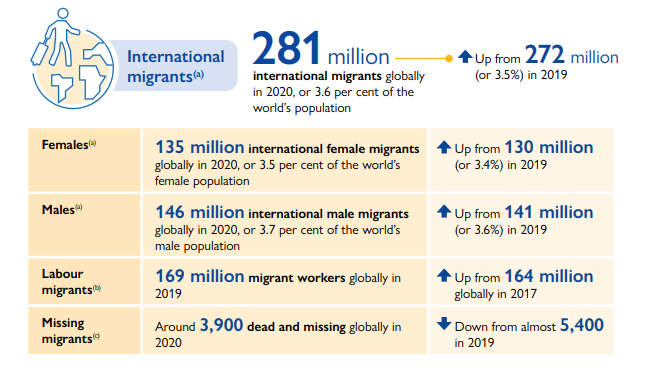 移民在全球總人口中所占的比例也有所增加,目前占比3.6%,這意味著每30人中就有1人是國際移民。