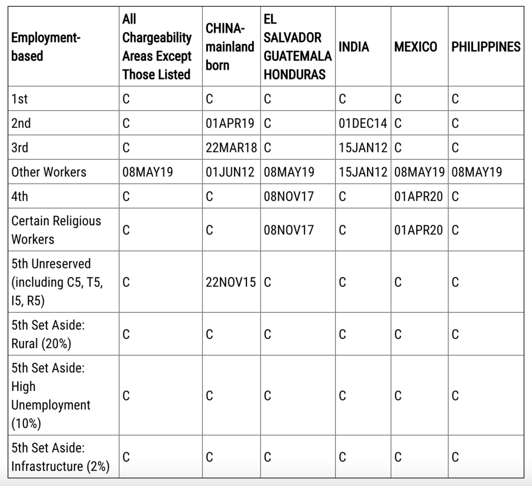 ·表B同樣除EB-2前進(jìn)1個(gè)月至2019年5月1日,其他各類(lèi)簽證項(xiàng)目排期無(wú)變化。