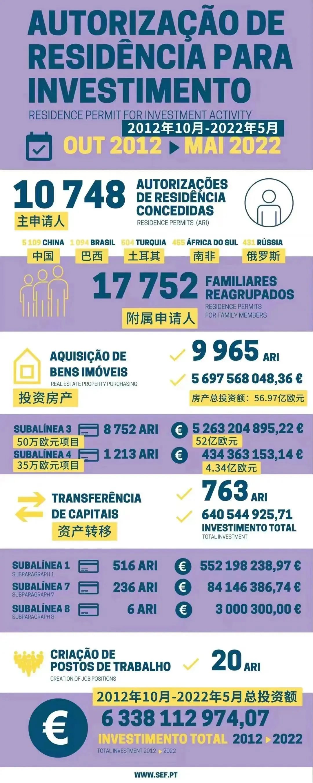 葡萄牙移民局也再次更新了2012年10月黃金居留政策推行以來的整體數(shù)據(jù),數(shù)據(jù)顯示,10年來,已有10748位主申請人獲批葡萄牙黃金簽證,其中中國家庭為5109組,占比約50%,可見中國投資者對葡萄牙項目的喜愛和認可。通過黃金簽證計劃,葡萄牙共吸納了63.38億歐元投資,其中56.97億資金直接投資于房地產(chǎn)市場。